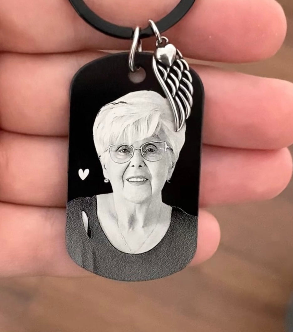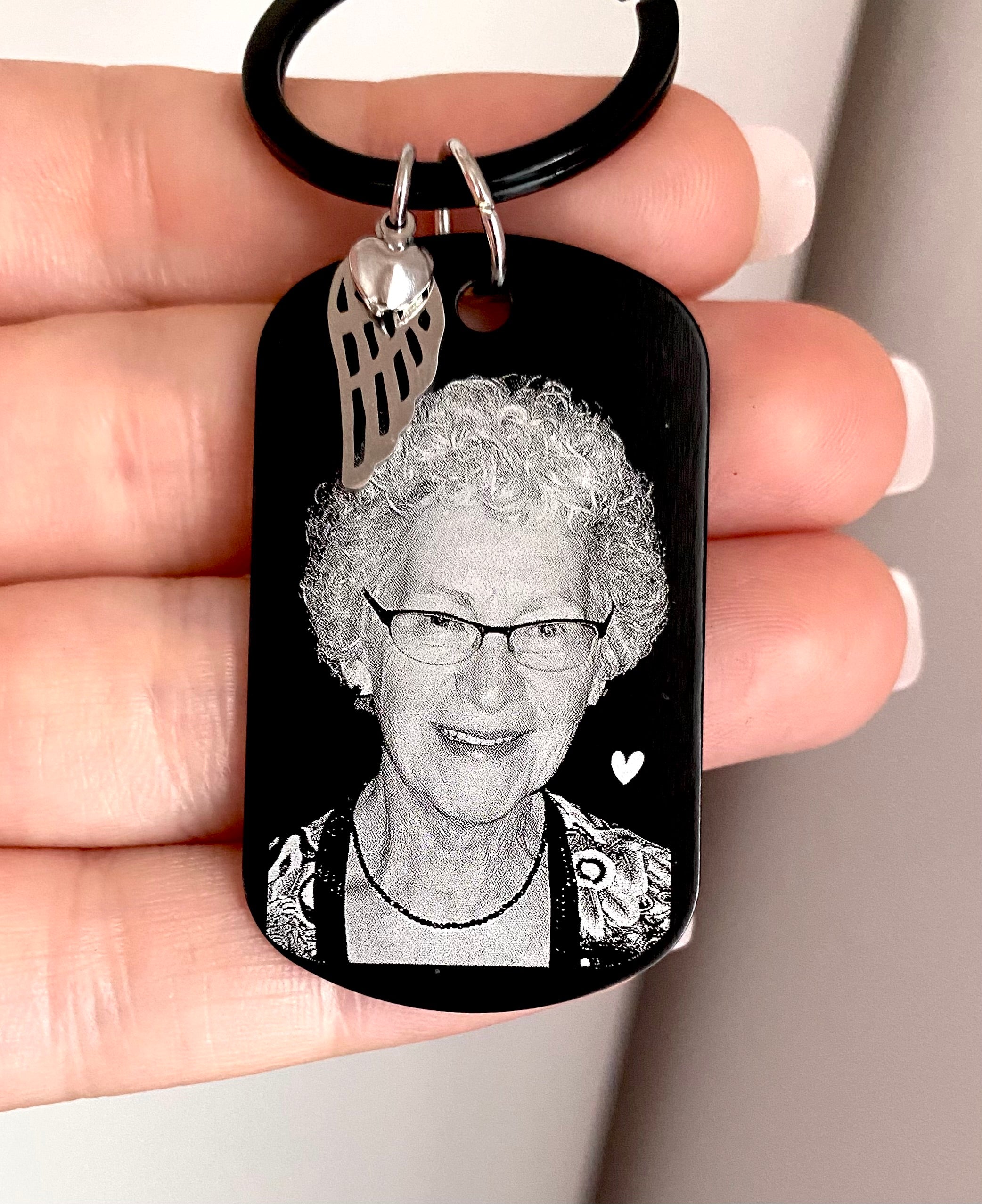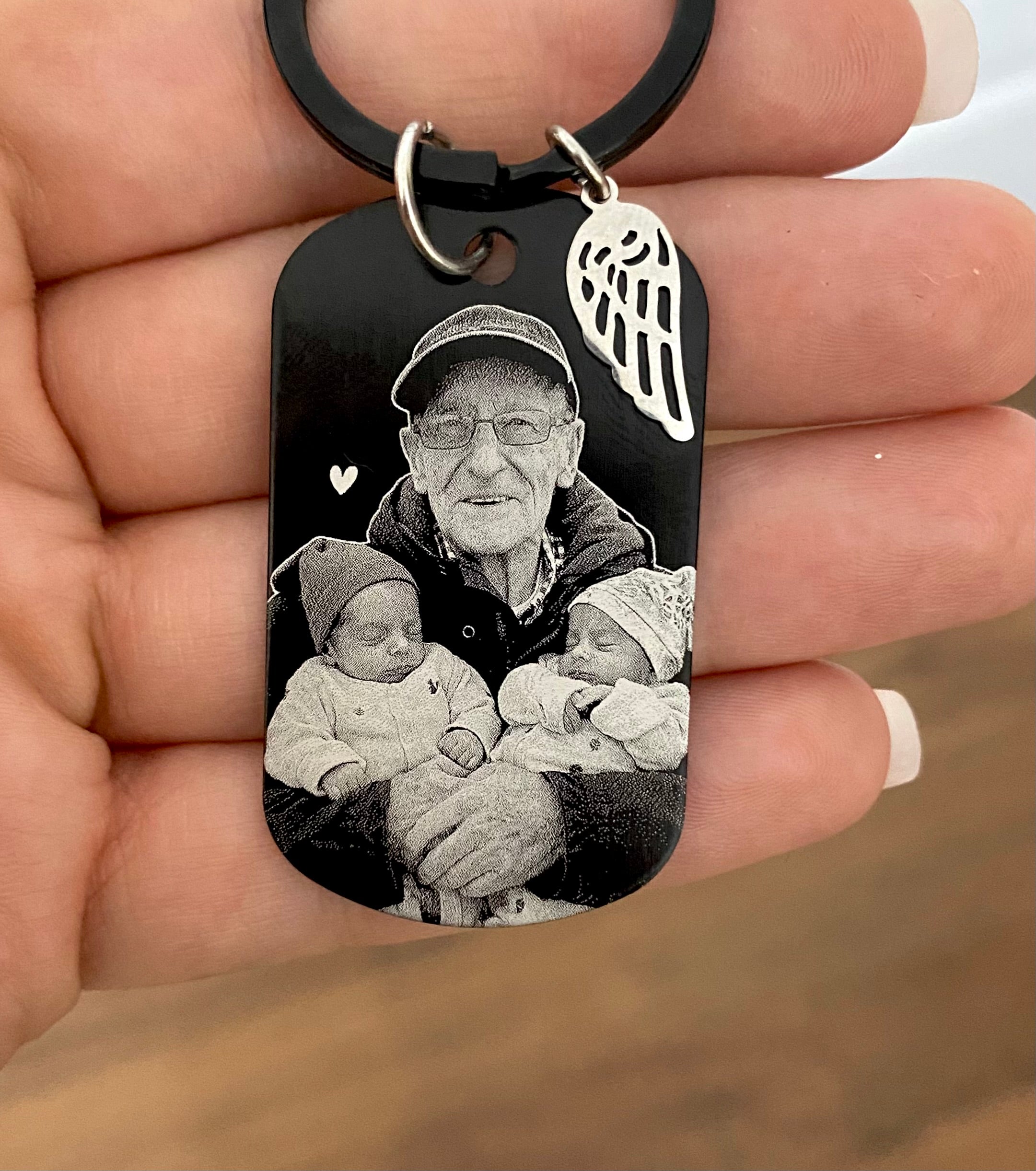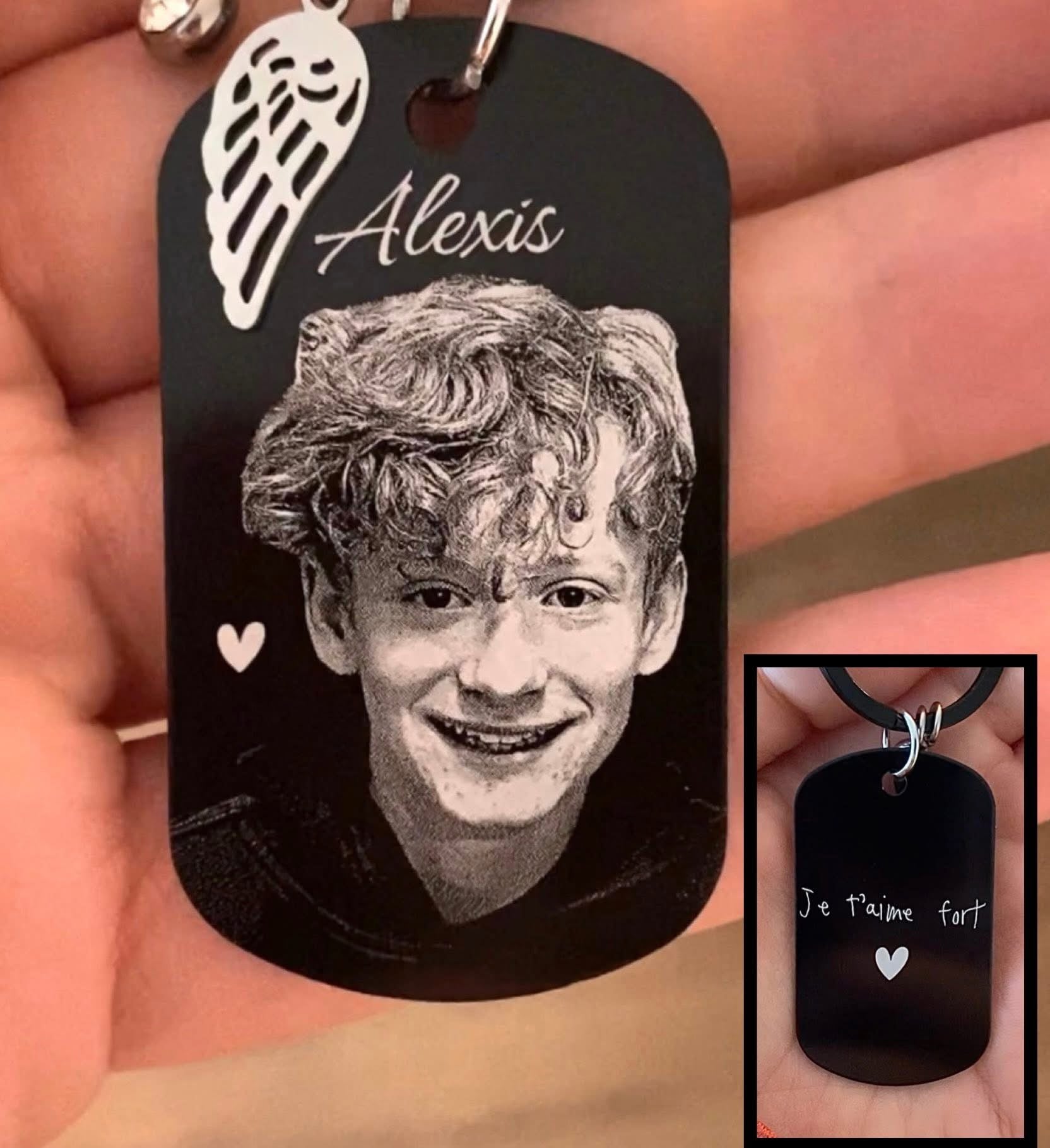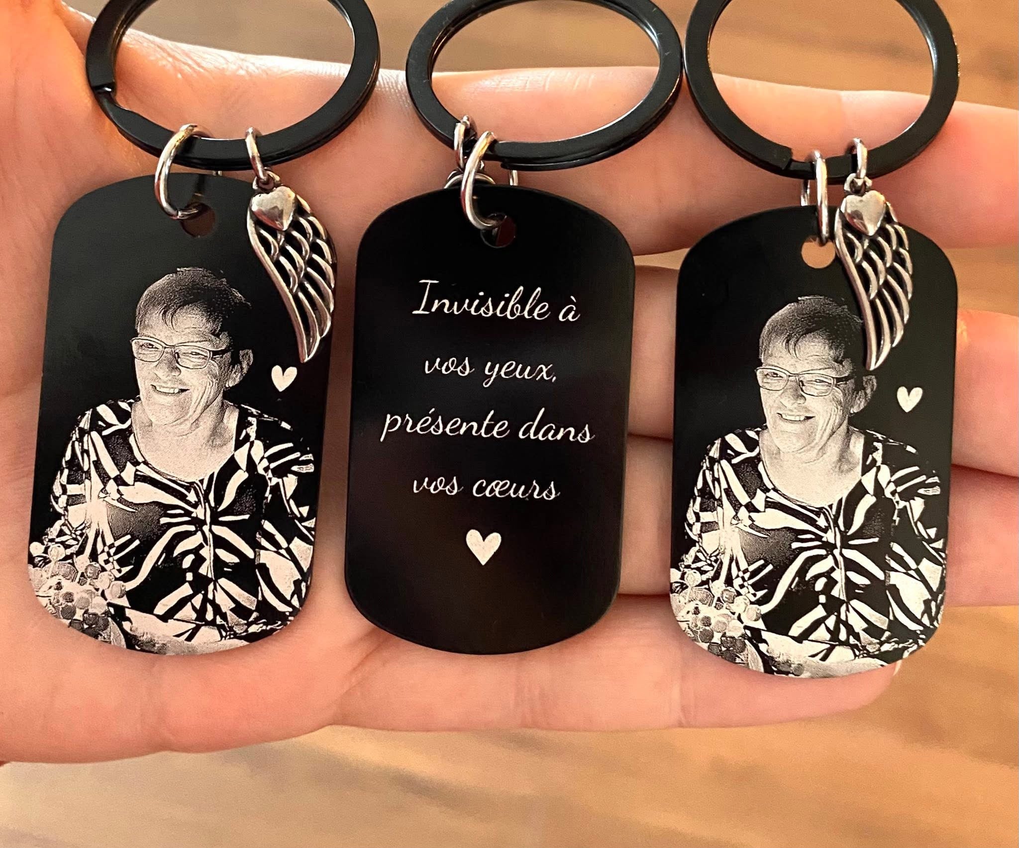 Merci de télécharger la photo un peu plus bas avant de terminer la commande. Le décor derrière la personne sera retiré. Nous verrons son visage et le haut de son corps. Un petit coeur sera gravé tout près et une breloque aile d’ange avec coeur sera ajoutée au porte clés.