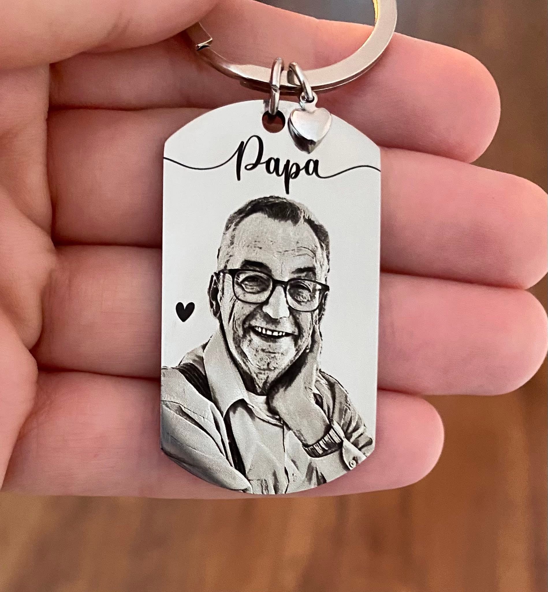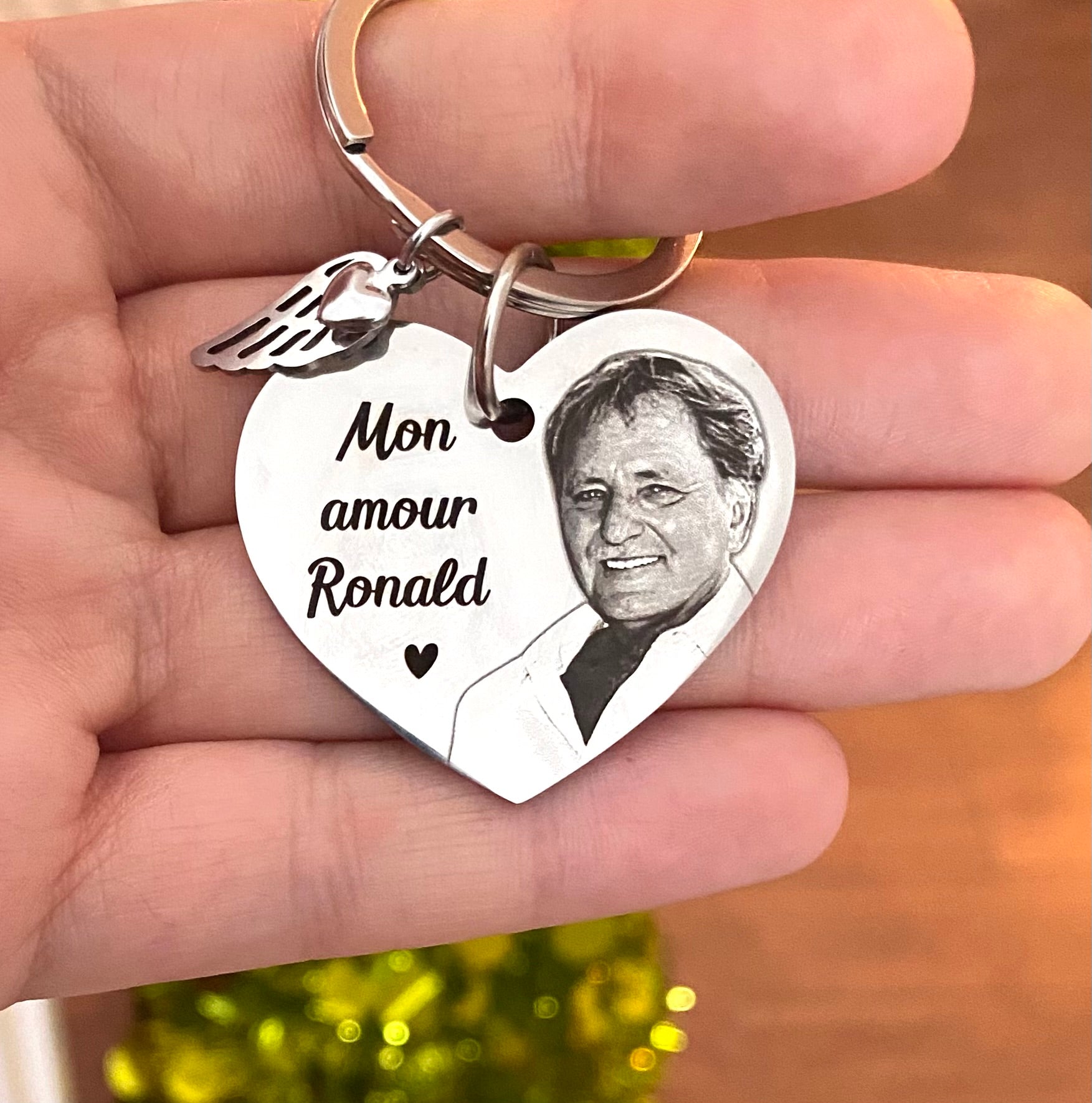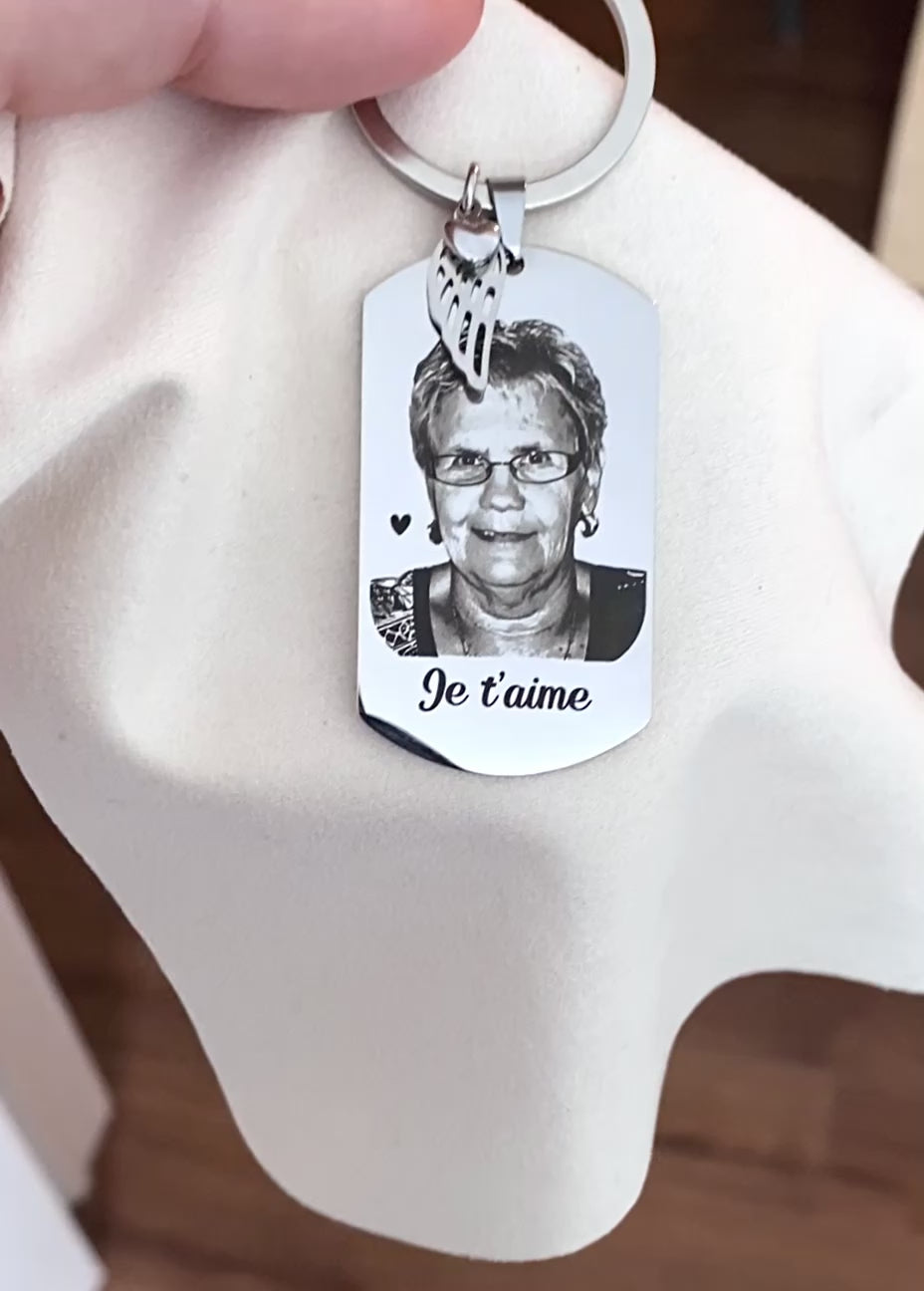 Merci de télécharger la photo un peu plus bas avant de terminer la commande. Le décor derrière la personne sera retiré. Nous verrons son visage et le haut de son corps. Un petit coeur sera gravé tout près et une breloque aile d’ange avec coeur sera ajoutée au porte clés.